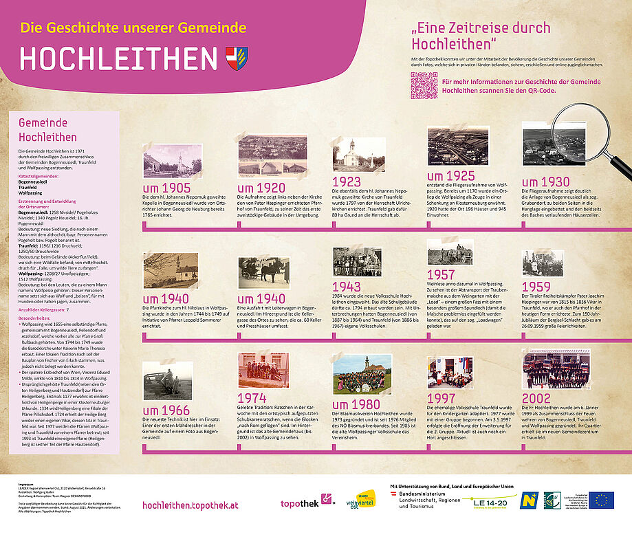 Hier kannst du viel Wissenswertes über die Geschichte deiner Gemeinde nachlesen. Klick dich durch frühere Zeiten in den Katastralgemeinden mit geschichtlichen Hintergründen und Fakten aus den Büchern von Franz Xaver Schweickhardt. Begib dich auf die Reise zu den denkmalgeschützten Objekten deiner Gemeinde und finde online Details dazu. Mit dem Online-Archiv Topothek wird die Geschichte unserer Gemeinde detailreich dokumentiert und ist für jeden einsehbar. Die LEADER Region Weinviertel Ost unterstützt bei der Suche nach historischem Bildmaterial. Gemeinsam möchten wir alle BürgerInnen dazu motivieren, nach altem Bildmaterial zu suchen, damit die Topothek ständig erweitert wird. So können wir gemeinsam die Geschichte unserer Gemeinde aufrecht erhalten. Auf www.topothek.at können die historischen Bilder, Fotos, Postkarten, Dokumente und Videos von jedermann und jedefrau aufgerufen und bewundert werde.